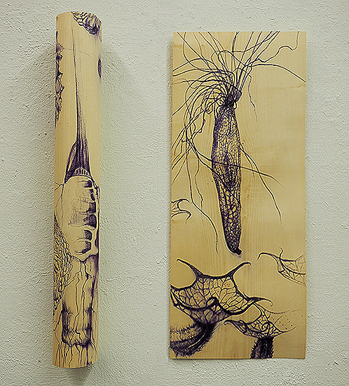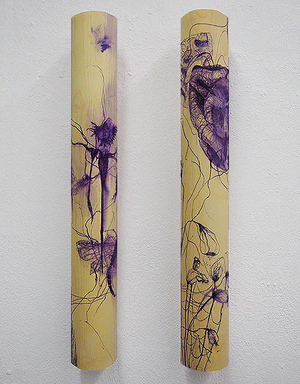 Aus der Serie „Pollenflug“ I 2015 I Kugelschreiber auf Holz I 15 x 15 x 80 cm / 80 x 35 cm